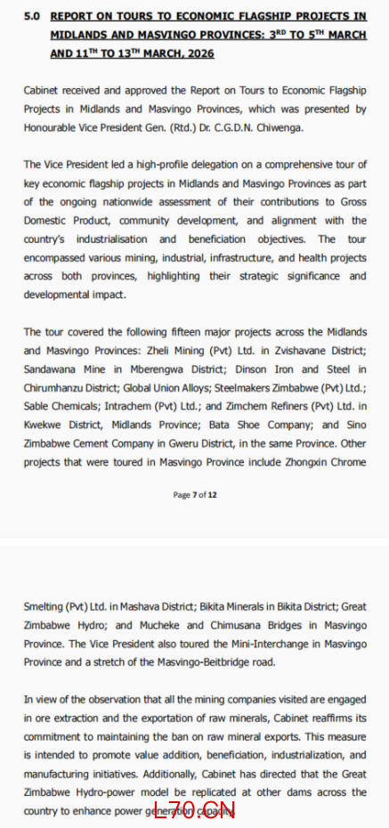 2026年3月31日津巴布韦发布第八次内阁会议内容以及最新政策细则,会议中关于锂矿出口禁令的核心动向可总结为“禁令持续收紧且无松动,核心导向聚焦本土加工增值”。