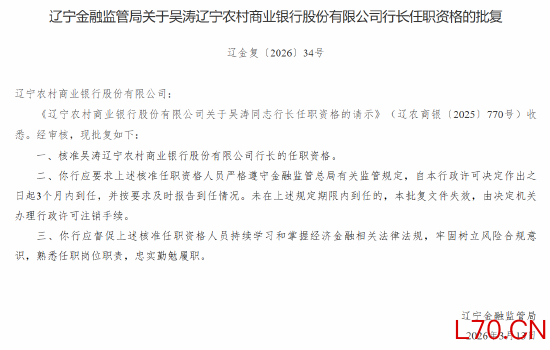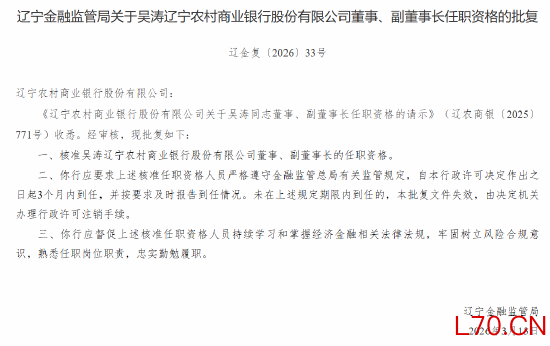 3月25日金融一线消息,辽宁金融监管局发布批复,核准吴涛辽宁农村商业银行股份有限公司董事、副董事长、行长的任职资格。