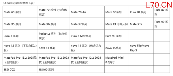 刚发的Pura90、Pura90 Pro、Pura90 Pro Max全系标配5A网络,之前的 Mate80 系列、Mate X7 系列、nova15 系列都已支持,后续老机型会通过鸿蒙系统更新陆续放开。具体支持机型参考下表: