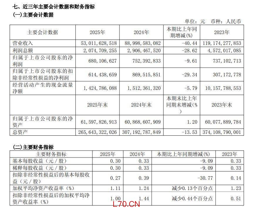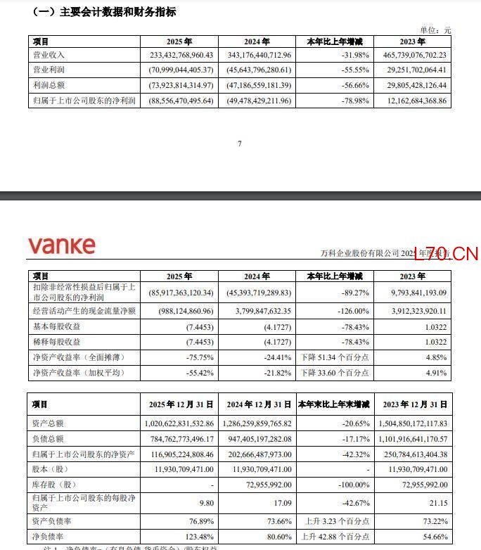 元股证券根据万科2025年度报告数据,2025年万科实现营业收入2334.3亿元,归属于上市公司股东的净亏损885.6亿元,同比分别下降32%和79.0%。值得注意的是,这是A股自1990年成立以来上市公司单年最大亏损纪录,超越2020年海航控股640亿元的亏损规模。