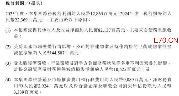 不过如果剔除债务重组收益,碧桂园经营层面仍处于阶段性亏损状态,2025年实现毛亏损431.18亿元,主要是对现有项目对应的存货全年计提了约445亿元减值,加上金融资产和财务担保计提了105亿元减值损失。换句话说,碧桂园账面上的盈利一定程度上来看不是赚出来的。