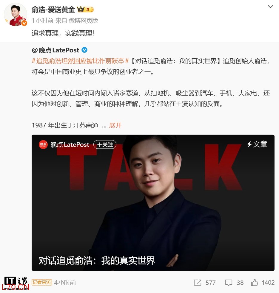 IT之家 4 月 20 日消息,追觅创始人兼 CEO 俞浩今天接受晚点 LatePost 采访ETF交易信息门户,谈自己为何“疯狂”。