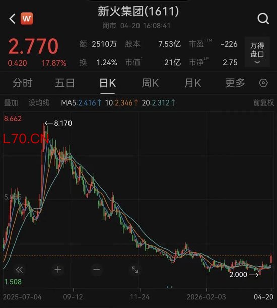 新火集团公司原名为“新火科技控股”,今年3月27日,刚刚更名为“新火集团”。公司曾经是2025年的超级牛股。去年上半年,公司股价一直在2港元下方震荡,但从6月底、7月初突然爆发,到去年8月14日,最高涨到8.17港元。不到三个月时间,股价累计涨幅高达353%。
