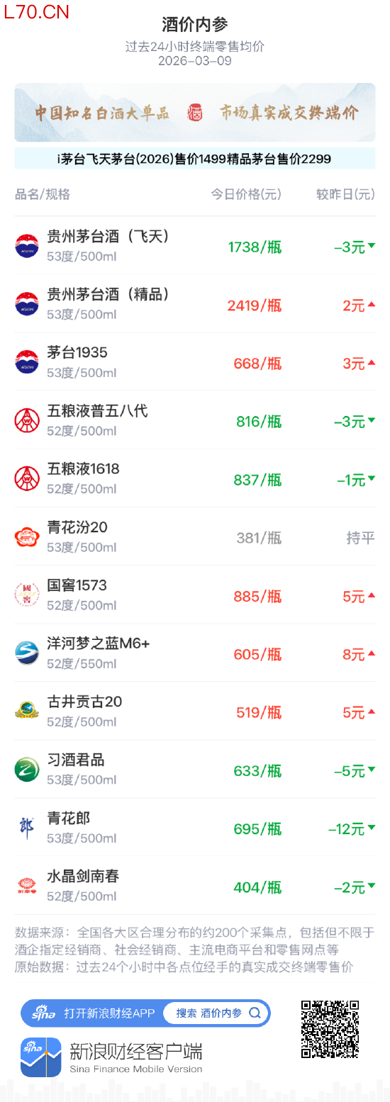 【酒价内参3月9日价格发布 整体价格小幅回落创近五天新低】新浪财经“酒价内参”过去24小时收集的数据显示,中国白酒市场各大单品的终端零售均价在3月9日整体小幅回落。如果主要单品各取一瓶打包售卖,今日总售价为10600元,较昨日下跌3元,为近五天以来新低。市场交投趋于平稳,价格运行重心小幅下移。