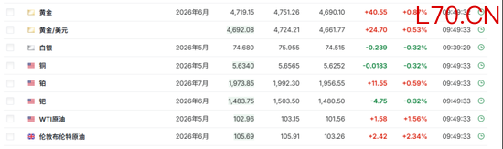 从大宗商品市场来看,刚刚又有新变化。昨晚大跌的原油大幅反弹,布伦特原油日内涨幅扩大至2%以上,现报105.69美元/桶。早上冲高的黄金、白银开始调整。