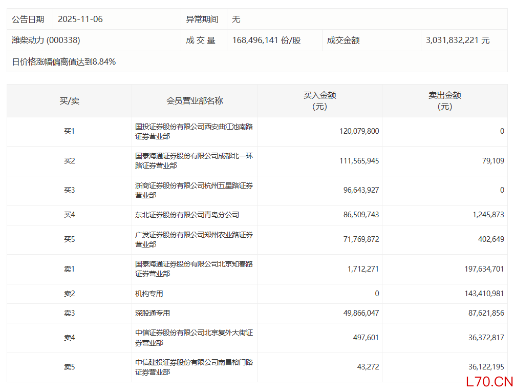 潍柴动力今日涨停,有1家机构专用席位净卖出1.43亿元潍柴动力今日涨停,有1家机构专用席位净卖出1.43亿元