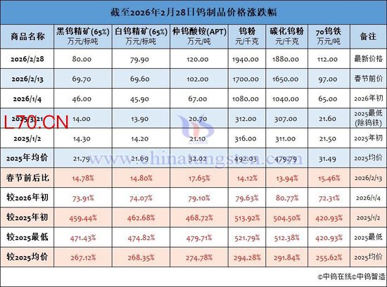 根据最新公开数据显示,截止2月28日,黑钨精矿(规格≥65%)价格已经超过80万元/吨,较年初上涨73.91%;仲钨酸铵(APT)价格为120万元/吨,较年初上涨79.1%;钨粉价格为1940元/千克,较年初上涨79.63%。整体来看,目前黑钨精矿、仲钨酸铵(APT)和钨粉的价格,均已较2025年初的价格接近翻了5倍空间!(如下图所示)
