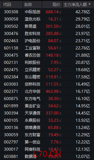 个股方面,中际旭创获得逾42亿元主力资金净流入,蓝色光标、新易盛、胜宏科技等7股获得超20亿元净流入,立讯精密、东山精密等17股也获得超10亿元净流入。